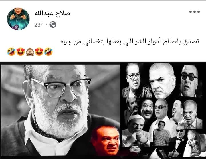 وشارك صلاح عبد الله جمهوره صور للأدوار التي جسدها وحققت نجاح كبير، وذلك من خلال حسابه الرسمي عبر موقع التواصل الاجتماعي “فيسبوك”، وعلق مازحًا: “تصدق يا صالح أدوار الشر اللي بعملها بتغسلني من جوا”.