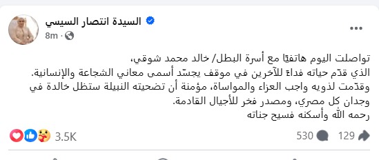 وكتب السيدة انتصار السيسي عبر صفحتها الرسمية على فيسبوك: تواصلت اليوم هاتفيا مع أسرة البطل خالد محمد شوقي، الذي قدم حياته فداء للآخرين في موقف يجسد أسمى معاني الشجاعة والإنسانية.
