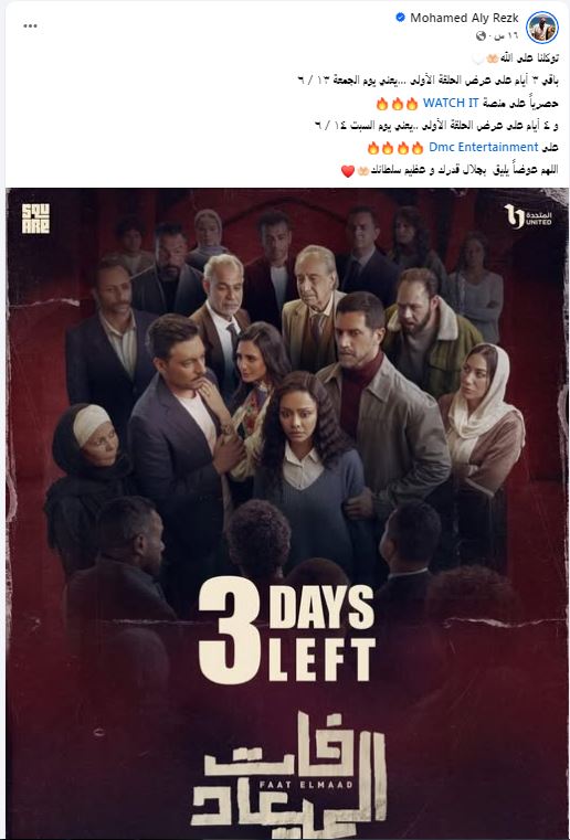روج الفنان محمد علي رزق لمسلسل "فات الميعاد" بطولة الفنانة أسماء أبو اليزيد و الفنان أحمد مجدي والذي من المقرر عرضه بداية من يوم الجمعة الموافق 13 يونيو على منصة Watch it الرقمية و قناة Dmc ".