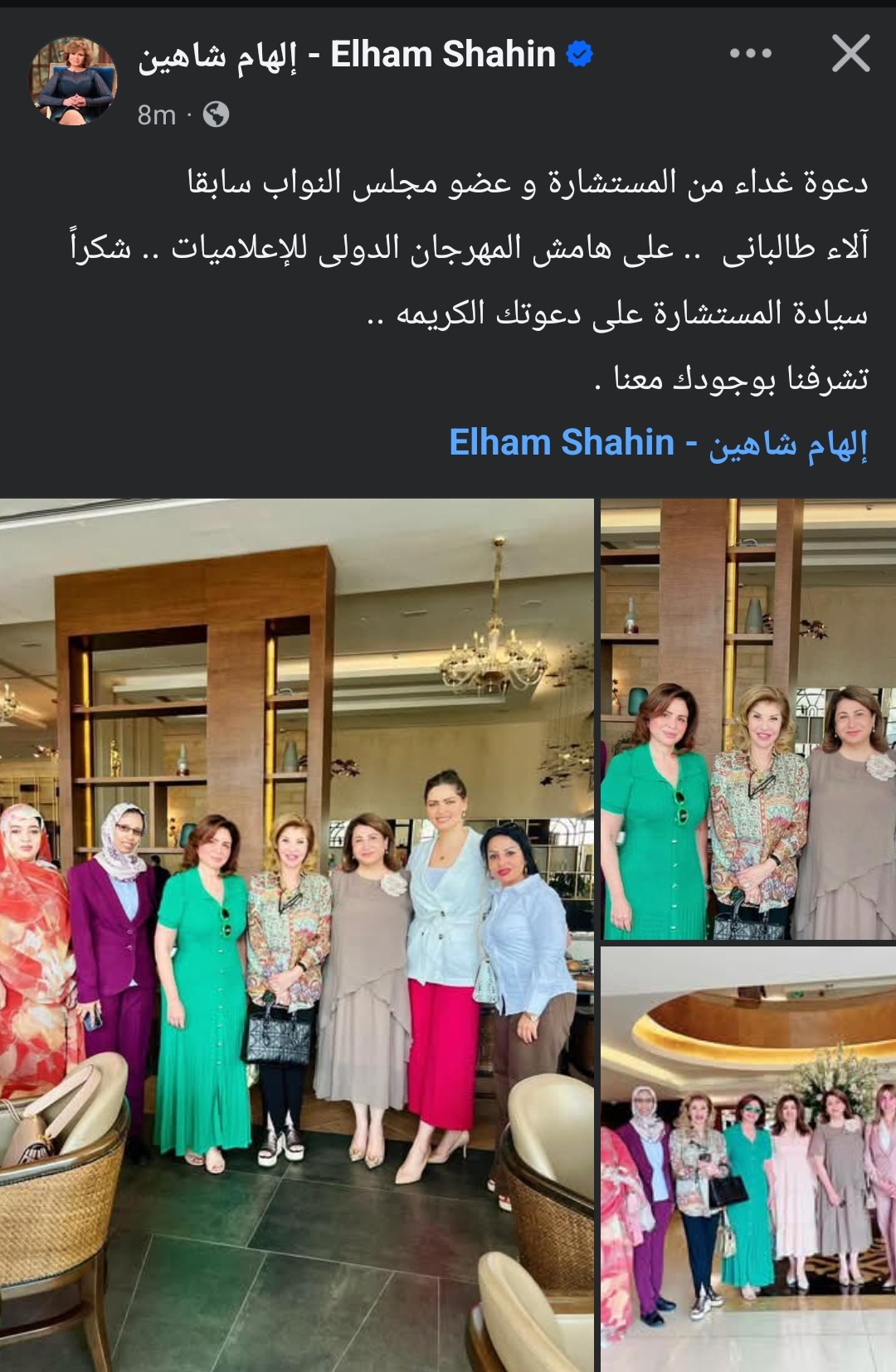 ونشرت إلهام شاهين على صفحتها الرسمية على موقع التواصل الاجتماعي الفيسبوك، صورا لها وكتبت: "دعوة غداء من المستشارة و عضو مجلس النواب سابقا آلاء طالباني، على هامش المهرجان الدولى للإعلاميات، شكراً سيادة المستشارة على دعوتك الكريمه، تشرفنا بوجودك معنا".