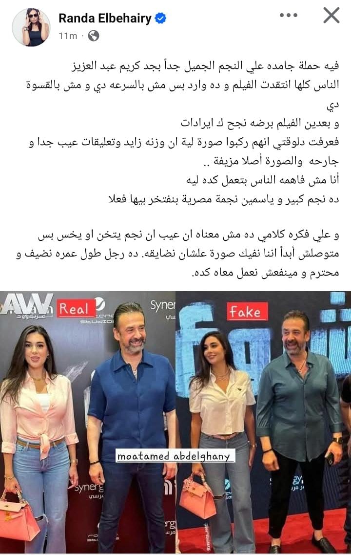 ونشرت راندا البحيري عبر حسابها الرسمي على موقع التواصل الاجتماعي الفيسبوك: “فيه حملة جامده علي النجم الجميل جداً بجد كريم عبد العزيز، الناس كلها انتقدت الفيلم و ده وارد بس مش بالسرعه دي و مش بالقسوة دي”.