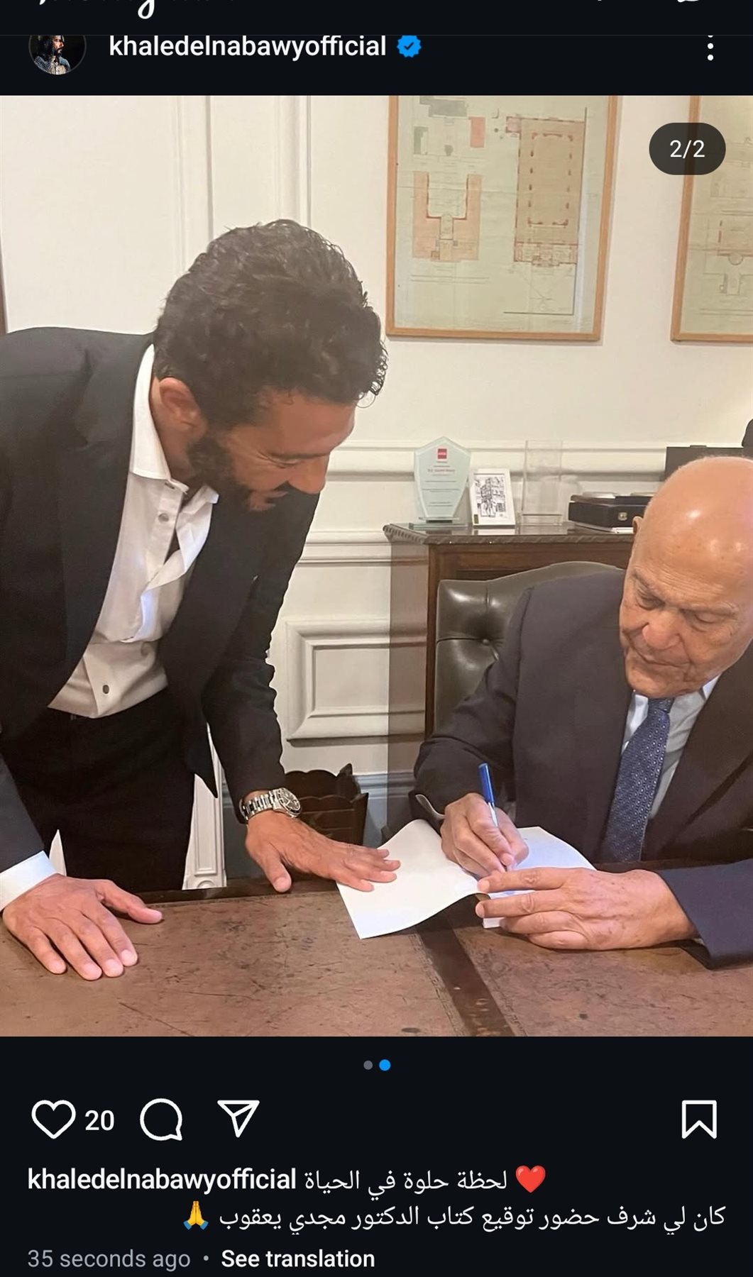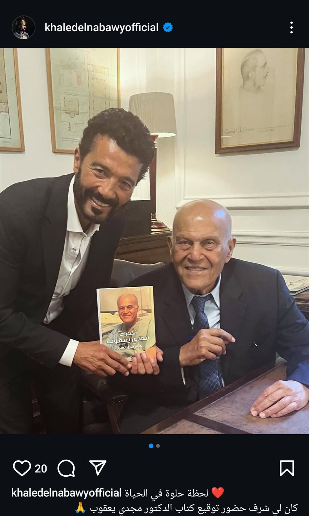 ونشر عبر حسابه الرسمي على موقع التواصل الاجتماعي لتبادل الصور والفيديوهات الانستجرام: “لحظة حلوة في الحياة، كان لي شرف حضور توقيع كتاب الدكتور مجدي يعقوب”.