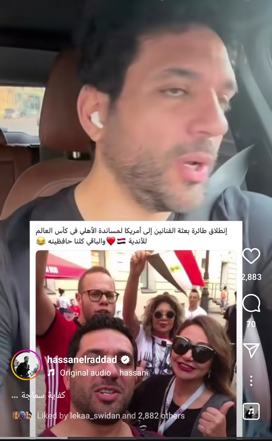 وقال حسن الرداد في فيديو عبر حسابه الشخصي بموقع التواصل الاجتماعي لتبادل الصور والفيديوهات “انستجرام”: "في ناس منزله صورتي مع مجموعة من النجوم وبيقولوا إننا رايحين نشجع الأهلي في كأس العالم للأندية".