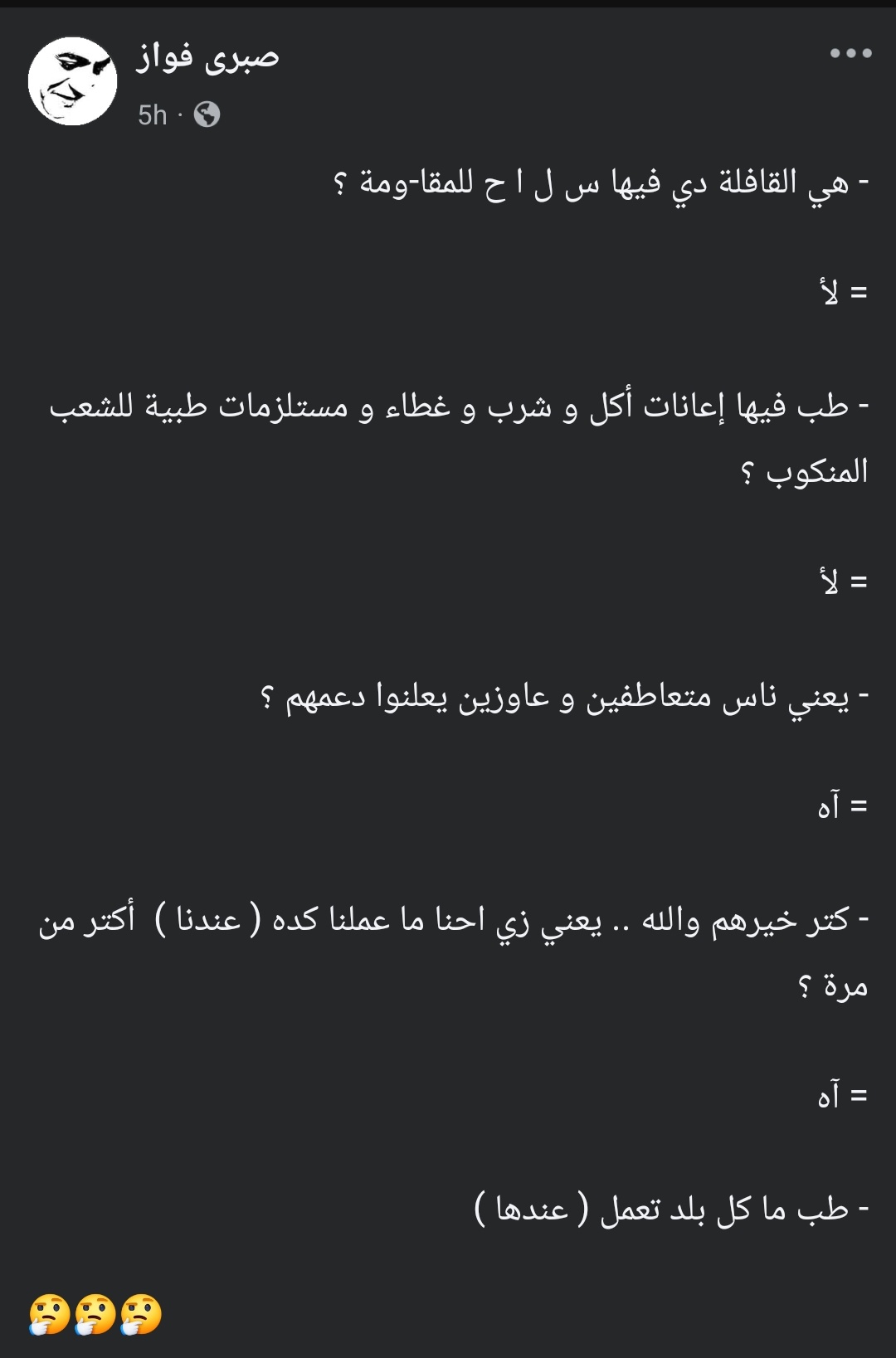 وكتب فواز عبر حسابه الرسمي على موقع التواصل الاجتماعي الفيس بوك: "هي القافلة دي فيها سلاح للمقاومة؟ طب فيها إعانات أكل وشرب وغطاء ومستشفيات؟، يعني ناس متعاطفين وعاوزين يعلنوا دعمهم.. كتر خيرهم والله.. يعني زي ما إحنا عملنا كده عندنا أكتر من مرة".