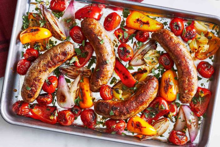 يقطع الفلفل الألوان شرائح ويضاف للسجق.