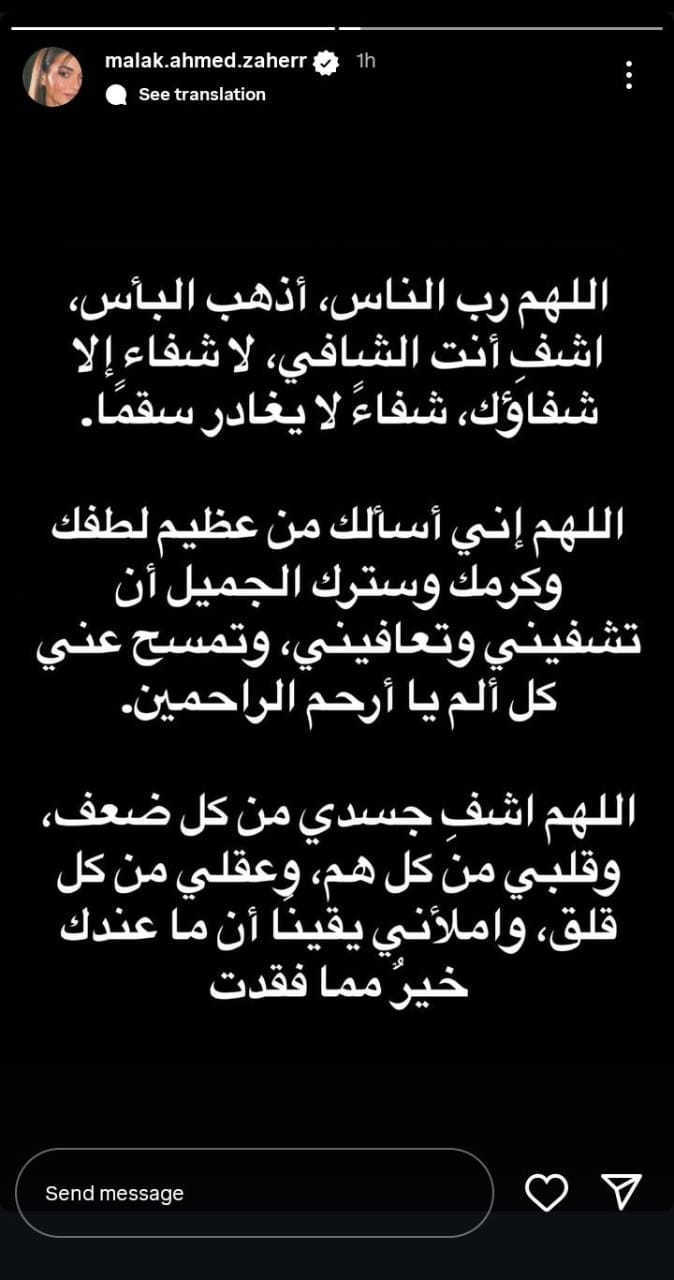 وكتبت ملك زاهر من خلال حسابها الرسمي عبر موقع تبادل الصور والفديوهات القصيرة "إنستجرام"، عبر خاصية استوري: "اللهم رب الناس، أذهب البأس، اشف أنت الشافي، لا شفاء إلا شفاؤك، شفاءً لا يغادر سقما.. اللهم إني أسألك من عظيم لطفك وكرمك وسترك الجميل أن تشفيني وتعافيني، وتمسح عني كل ألم يا أرحم الراحمين.. اللهم اشف جسدي من كل ضعف، وقلبي من كل هم، وعقلي من كل قلق، واملأني يقينا أن ما عندك خير مما فقدت".