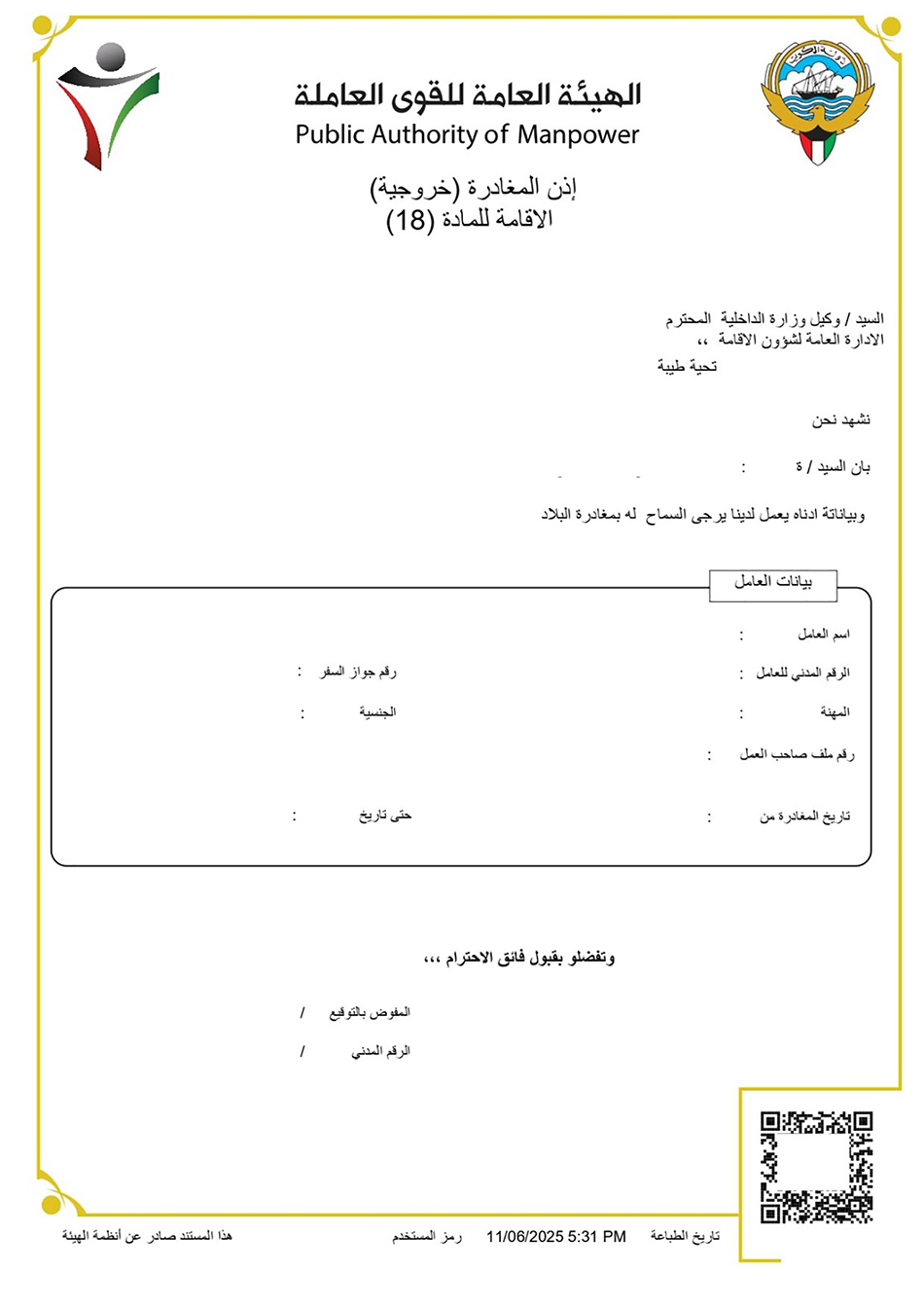 أهداف قرار إذن مغادرة للعمالة الوافدة في الكويت