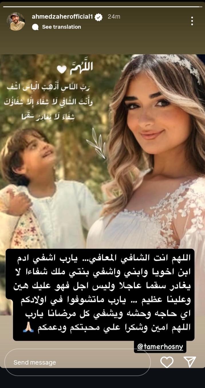 طالب الفنان أحمد زاهر بالدعاء لـ إبنته ملك زاهر و آدم نجل الفنان تامر حسني، وذلك بعد تعرضهما لـ أزمة صحية مفاجئة نُقلا علي آثرها إلي المستشفي.