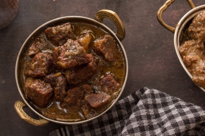 سخني ملعقتين كبيرتين من الزيت في قدر كبير على نار متوسطة، وشوحي اللحم في السمن على النار جيدًا ثم إضافة البصل والثوم.