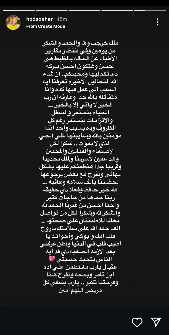 وكتبت هدي زاهر من خلال حسابها الرسمي عبر موقع تبادل الصور والفديوهات القصيرة إنستجرام، عبر خاصية استوري: "ملك خرجت والله والحمد والشكر من يومين وفي انتظار تقارير الأطباء عن الحالة بالظبط، هي أحسن وهتكون أحسن ببركة دعائكم ليها ومحبتكم.. إن شاء الله التحاليل الأخيرة تعرفنا إيه السبب اللي عمل فيها كده، وأنا متفائلة بالله جدًا وعارفة أن رب الخير لا يأتي إلا بالخير".
