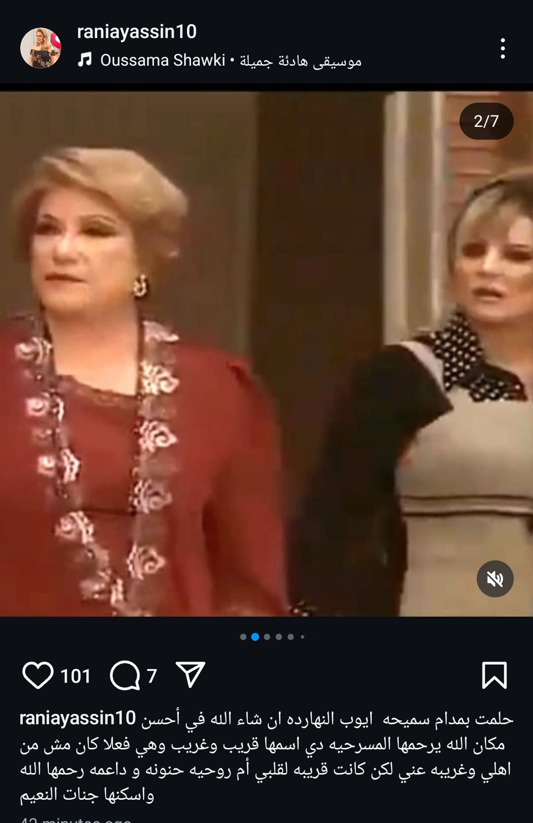 وفي سياق آخر، نعت الفنانة رانيا محمود ياسين، الفنانة القديرة سميحة أيوب التي رحلت عن عالمنا عن عمر ناهز 93 عاًما.