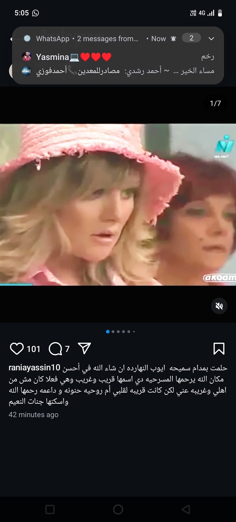 ونشرت عبر صفحتها الرسمية على موقع التواصل الاجتماعي لتبادل الصور والفيديوهات الانستجرام: “حلمت بمدام سميحه ايوب النهارده ان شاء الله في أحسن مكان الله يرحمها المسرحيه دي اسمها قريب وغريب وهي فعلا كان مش من اهلي وغريبه عني لكن كانت قريبه لقلبي أم روحيه حنونه و داعمه رحمها الله واسكنها جنات النعيم”.