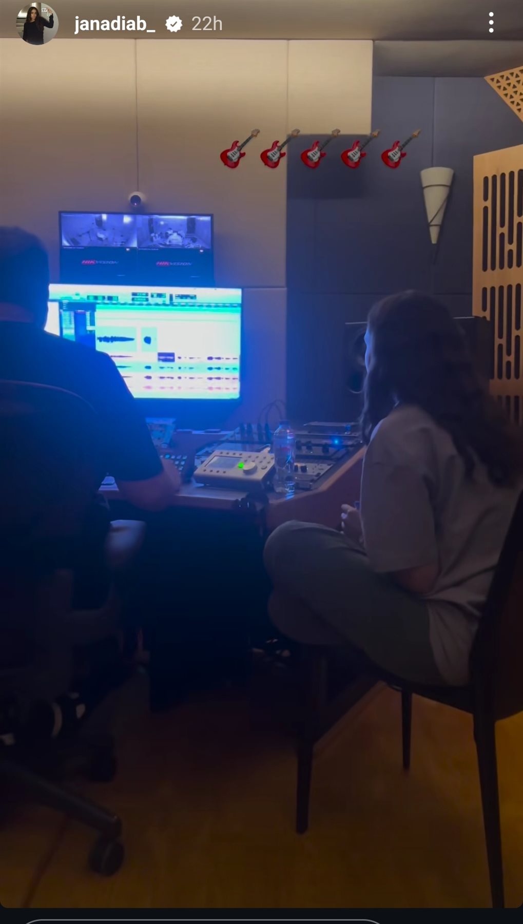 وظهر في الصور التي قامت بنشرها عبر خاصية الاستوري على موقع التواصل الاجتماعي لتبادل الصور والفيديوهات الانستجرام والدها الهضبة عمرو دياب اثناء تسجيل الأغنية ليكون داعما لها.