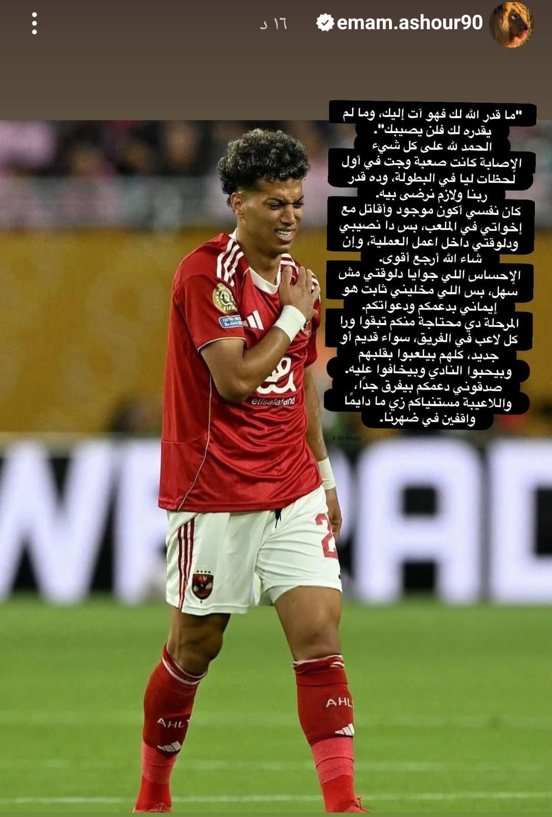 وكتب عاشور: "الحمدلله على كل شيء، كان نفسي أكون موجود وأقاتل مع إخواتي في الملعب، بس دا نصيبي وإن شاء الله أرجع أقوى".