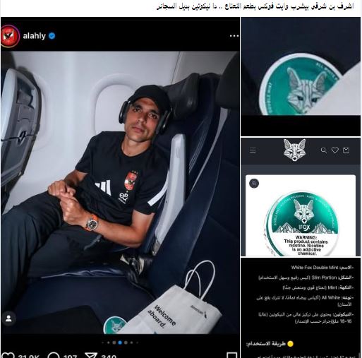 أثار لاعب النادي الأهلي أشرف بن شرقي الجدل خلال الساعات الماضية وذلك بعد نشر الصفحة الرسمية للنادي الأهلي صورة له من داخل الطائرة والتي أظهرت اللاعب ، بجواره كيس من منتج “White Fox”، أحد أشهر أنواع أكياس النيكوتين وهي واحدة من الماركات الرائدة في سوق أكياس النيكوتين، التي ظهرت في السنوات الأخيرة كبديل للتبغ وأثارت الصورة جدلا على مواقع التواصل الاجتماعي .