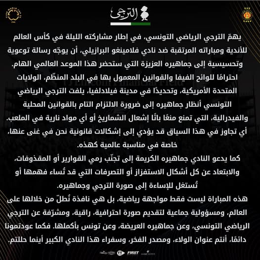 وجه نادي الترجي الرياضي التونسي رسالة هامة لجماهيره قبل ساعات من انطلاقة مباراة فلامنجو البرازيلي في إطار منافسات الجولة الأولى من بطولة كأس العالم للأندية.