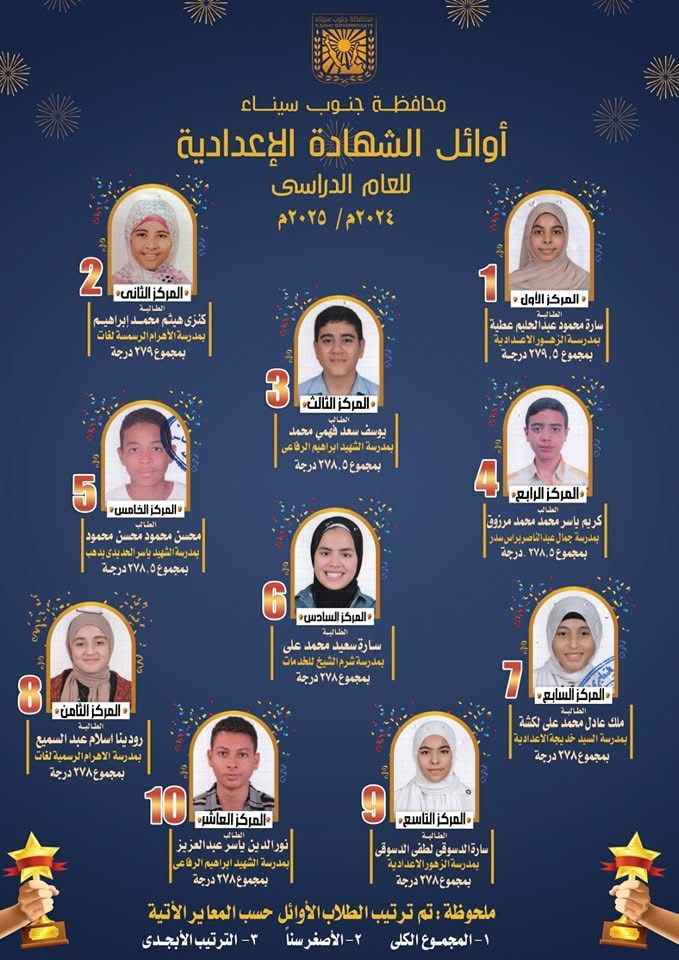 وأوضح مدير مديرية التربية والتعليم بجنوب سيناء أن ترتيب الأوائل تم وفقًا لعدة معايير تشمل: المجموع الكلي، ثم الأصغر سنًا، ثم الترتيب الأبجدي.