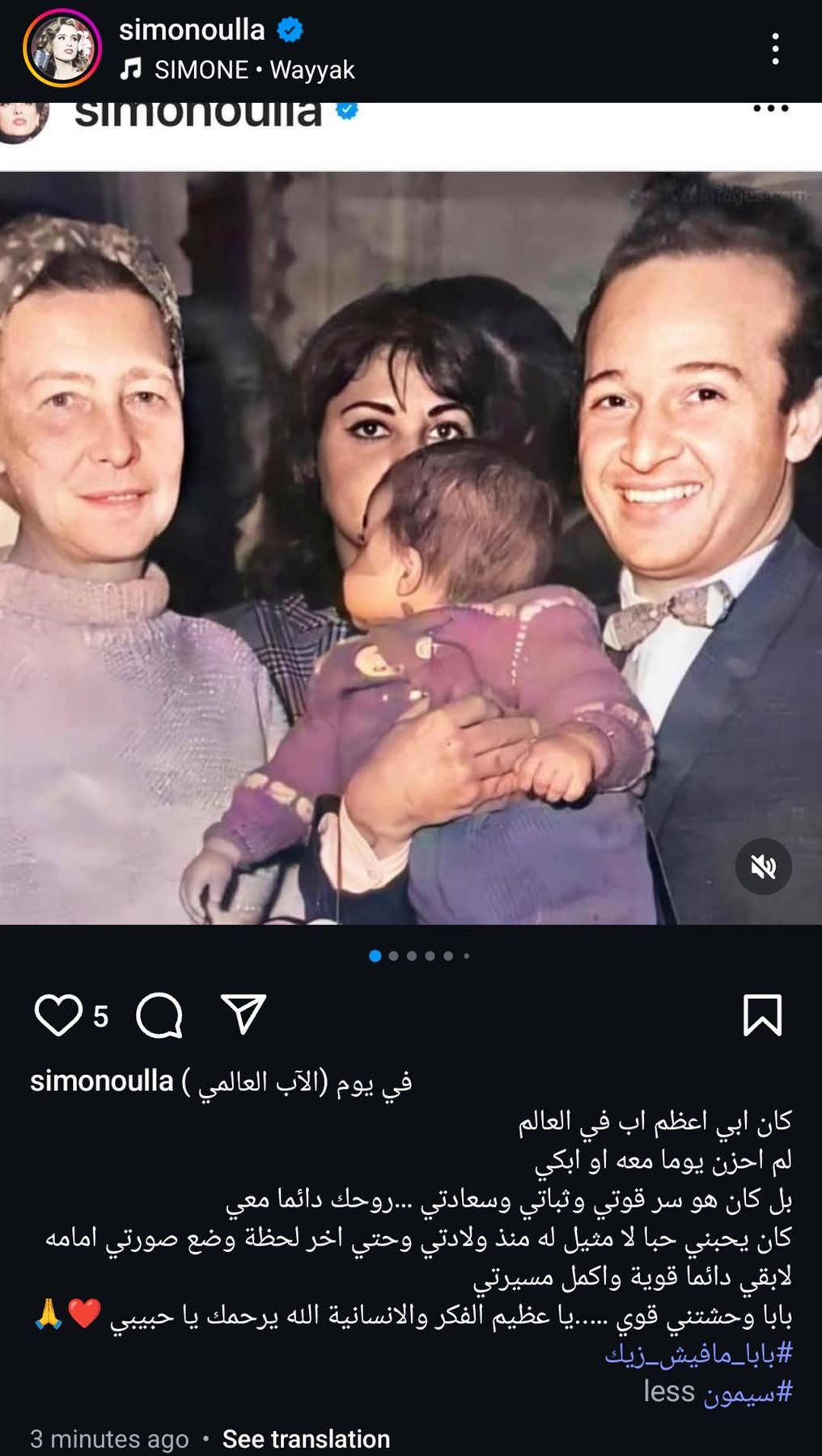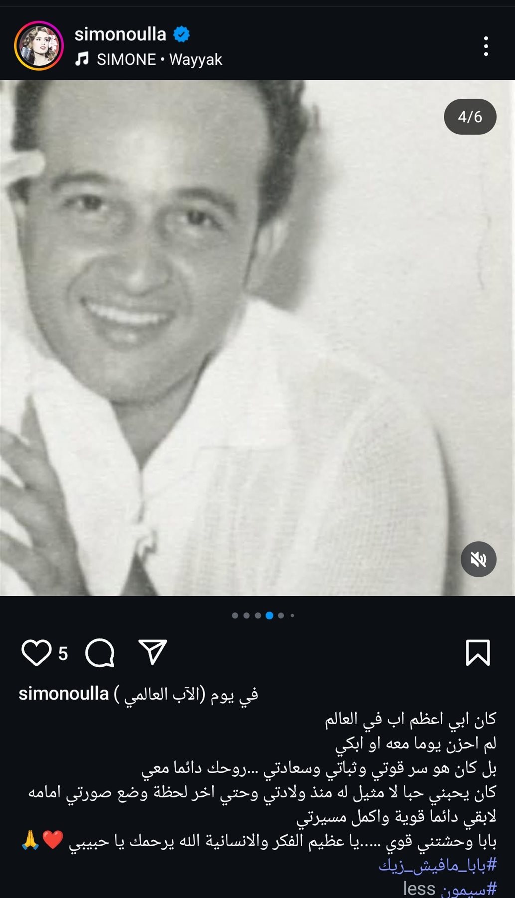وكتبت سيمون عبر حسابها الرسمي على موقع التواصل الاجتماعي لتبادل الصور والفيديوهات الانستجرام: “كان ابي اعظم اب في العالم، لم احزن يوما معه او ابكي، بل كان هو سر قوتي وثباتي وسعادتي، روحك دائما معي”.
