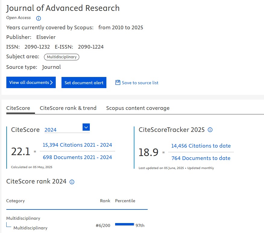 واضاف أن مجلة JAR حصلت الشهر الجاري على CiteScore بلغ 22.1 وفق تصنيف Scopus، ما وضعها في أعلى 3% من المجلات متعددة التخصصات على مستوى العالم.