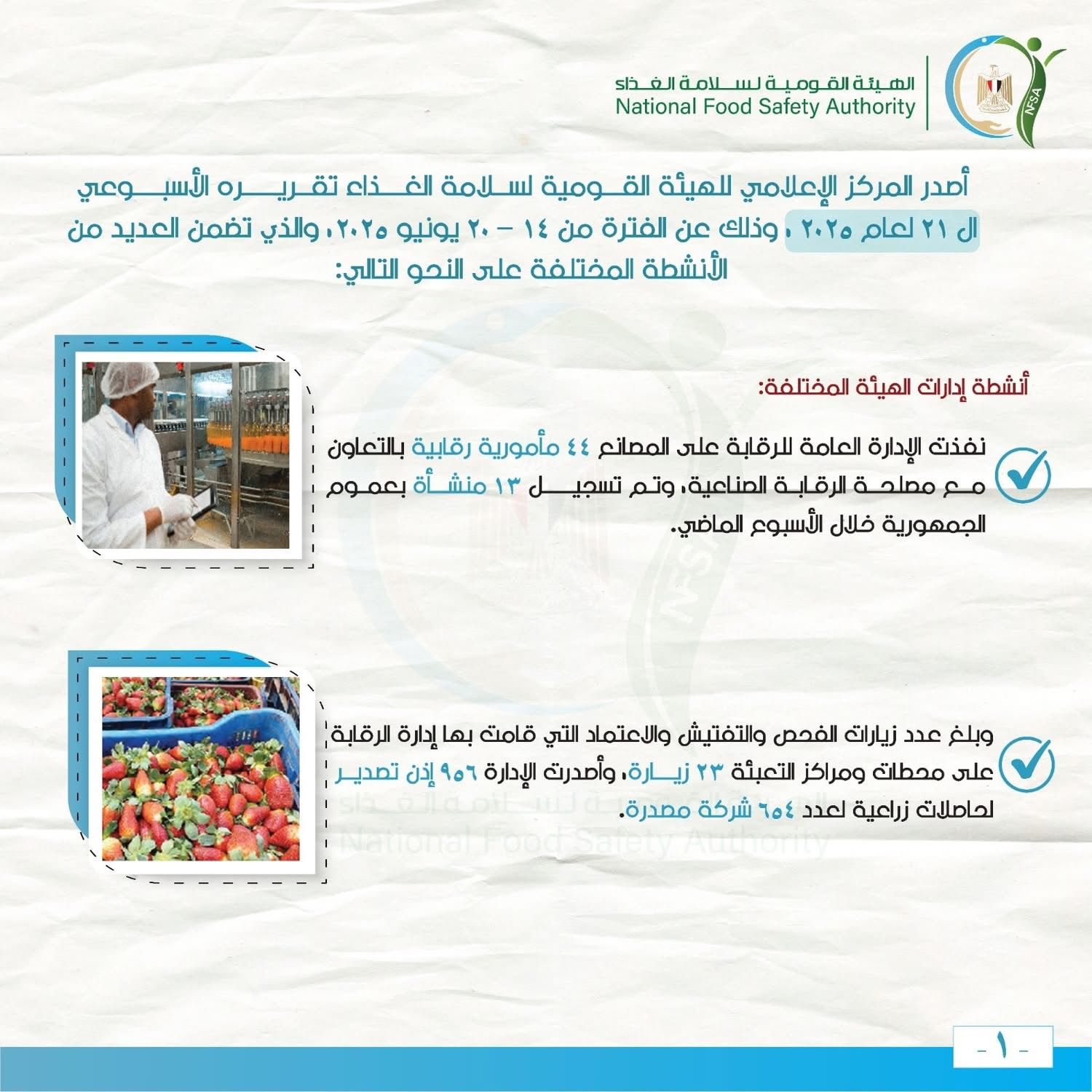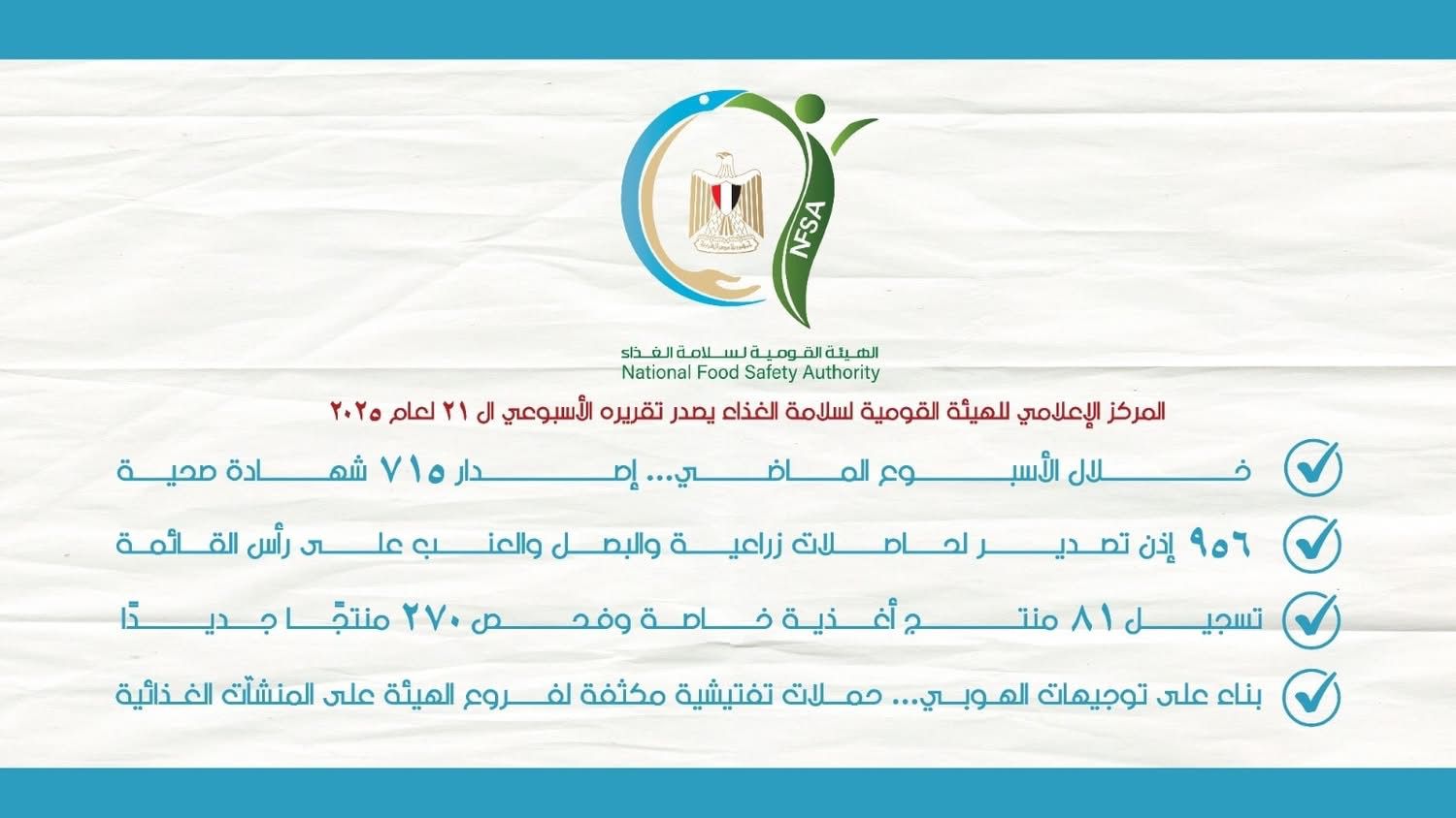 أصدر المركز الإعلامي للهيئة القومية لسلامة الغذاء تقريره الأسبوعي الـ 21 لعام 2025، وذلك عن الفترة من 14 - 20 يونيو، والذي تضمن العديد من الأنشطة المختلفة على النحو التالي: