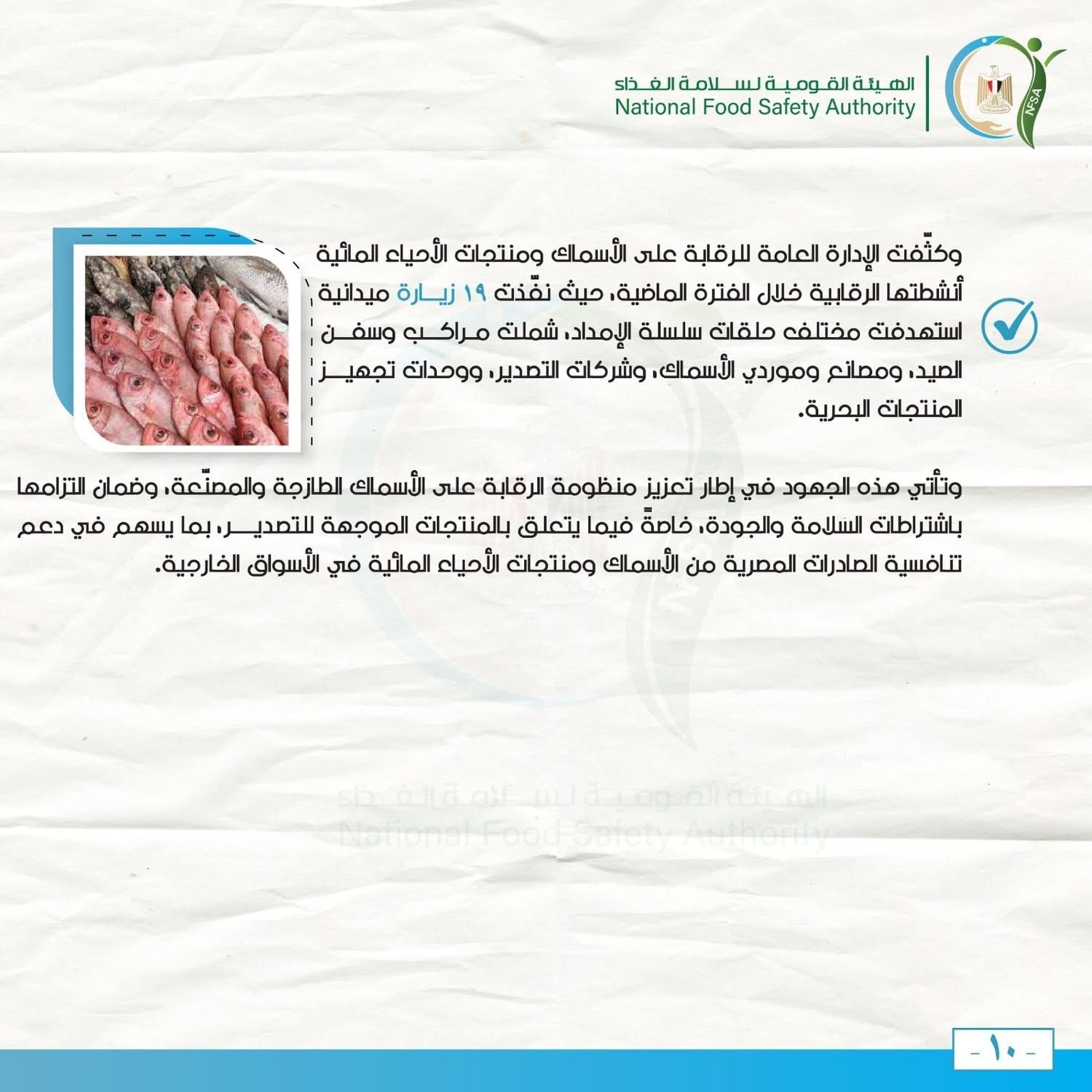 وكثّفت الإدارة العامة للرقابة على الأسماك ومنتجات الأحياء المائية أنشطتها الرقابية خلال الفترة الماضية، حيث نفّذت 19 زيارة ميدانية استهدفت مختلف حلقات سلسلة الإمداد، شملت مراكب وسفن الصيد، ومصانع وموردي الأسماك، وشركات التصدير، ووحدات تجهيز المنتجات البحرية.