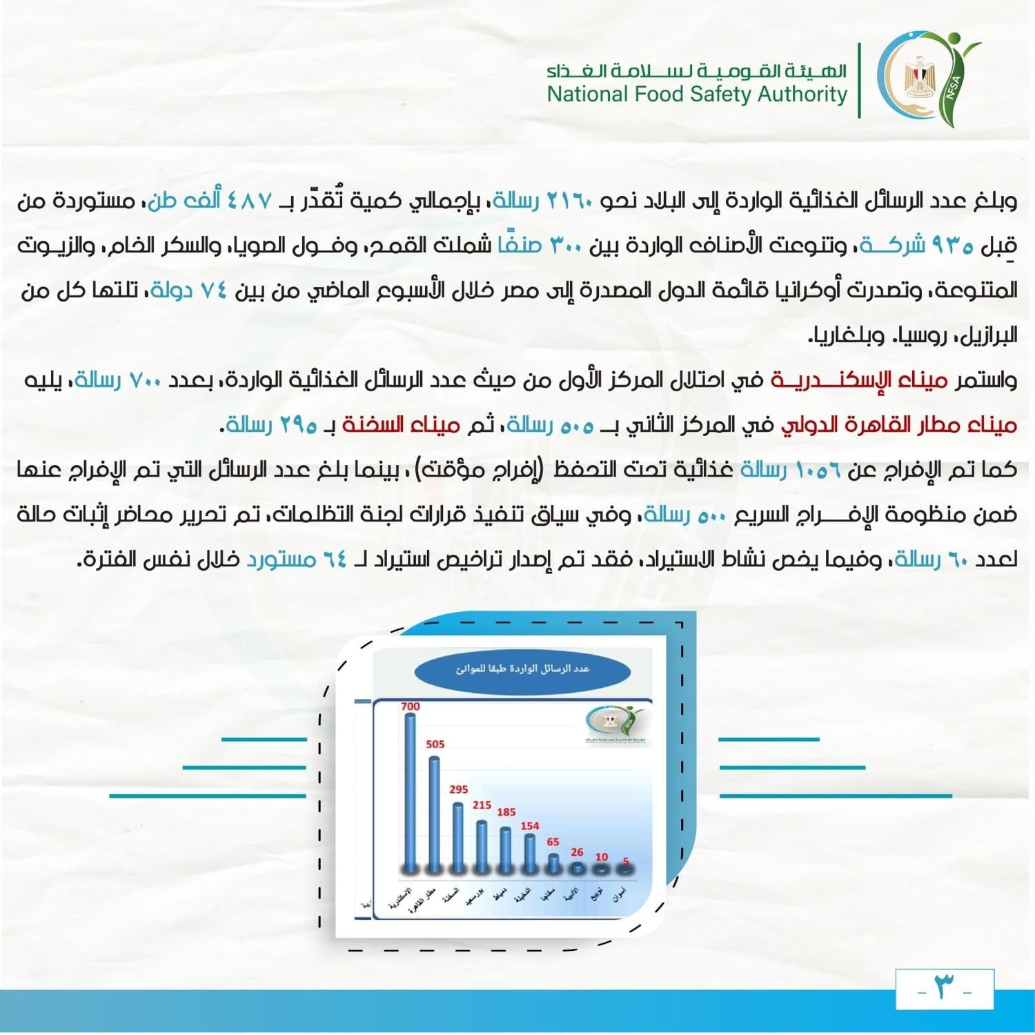 واستمر ميناء الإسكندرية في احتلال المركز الأول من حيث عدد الرسائل الغذائية الواردة، بعدد 700 رسالة، يليه ميناء مطار القاهرة الدولي في المركز الثاني بـــ 505 رسالة، ثم ميناء السخنة بـ 295 رسالة.
