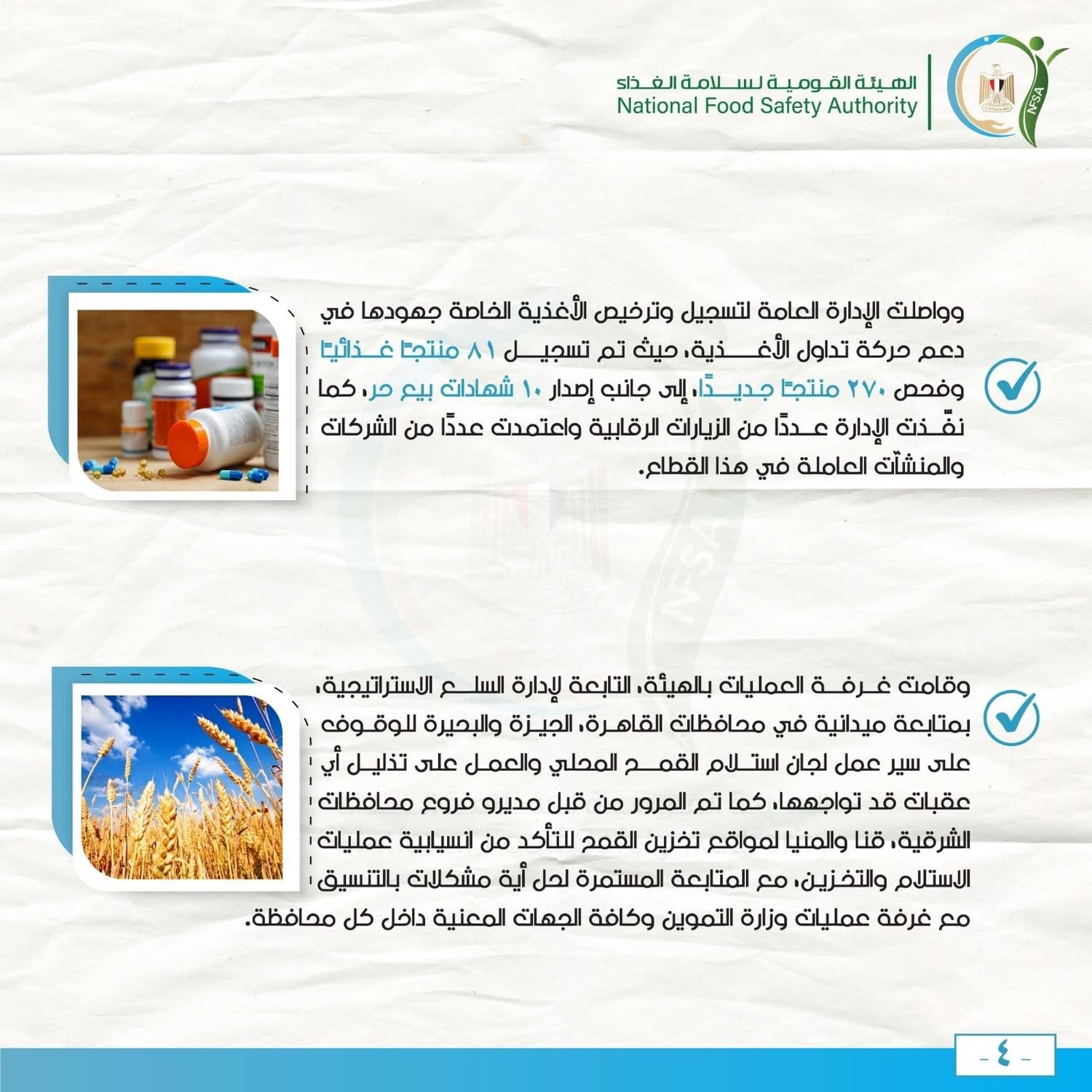 وواصلت الإدارة العامة لتسجيل وترخيص الأغذية الخاصة جهودها في دعم حركة تداول الأغذية، حيث تم تسجيل 81 منتجًا غذائيًا وفحص 270 منتجًا جديدًا، إلى جانب إصدار 10 شهادات بيع حر، كما نفّذت الإدارة عددًا من الزيارات الرقابية واعتمدت عددًا من الشركات والمنشآت العاملة في هذا القطاع.