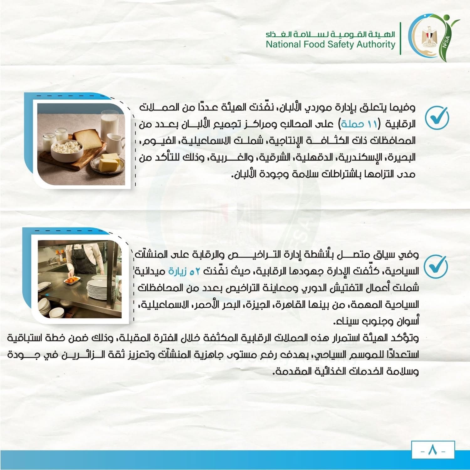 وفيما يتعلق بإدارة موردي الألبان، نفّذت الهيئة عددًا من الحملات الرقابية (11 حملة) على المحالب ومراكز تجميع الألبان بعدد من المحافظات ذات الكثافة الإنتاجية، شملت الاسماعيلية، الفيوم، البحيرة، الإسكندرية، الدقهلية، الشرقية، والغربية، وذلك للتأكد من مدى التزامها باشتراطات سلامة وجودة الألبان.