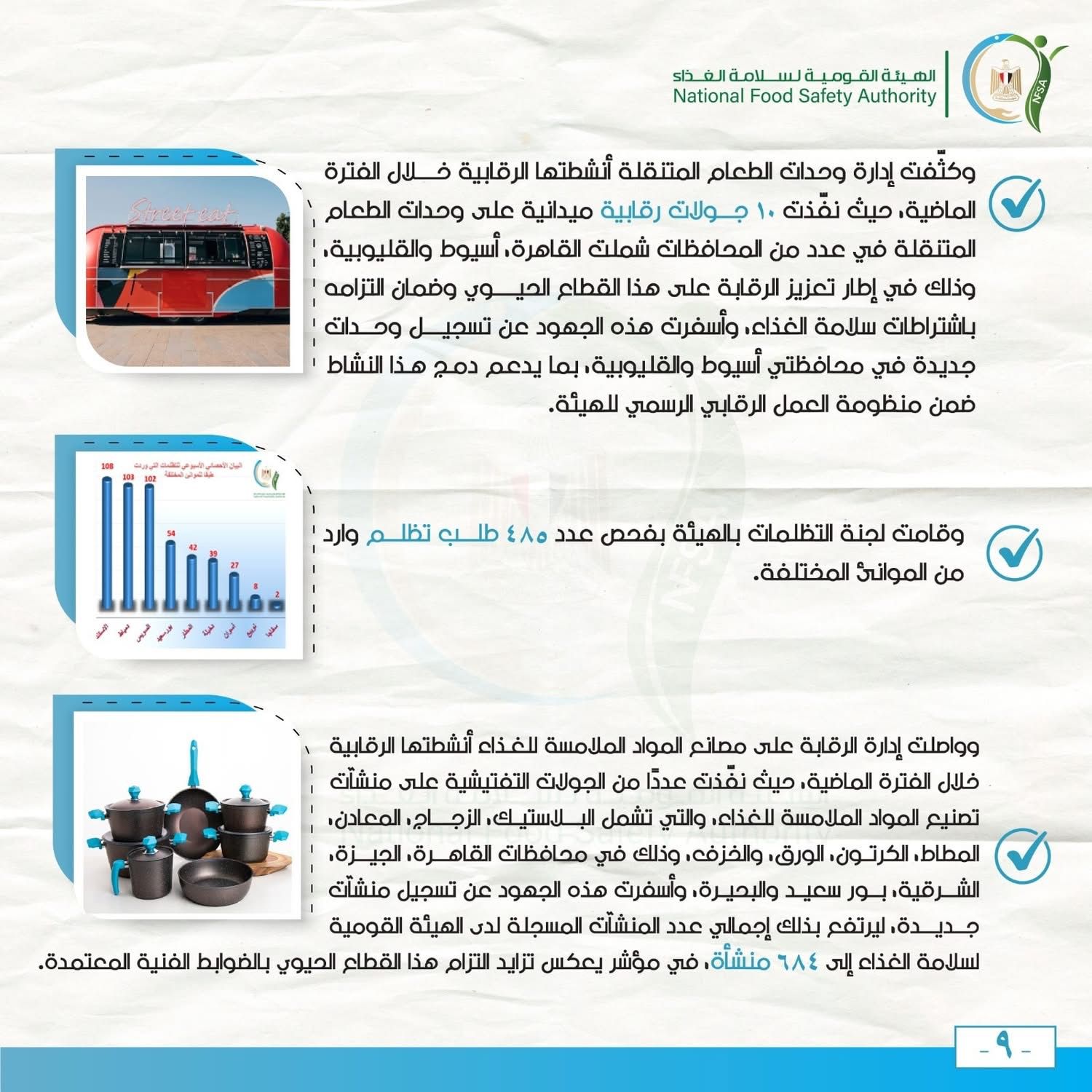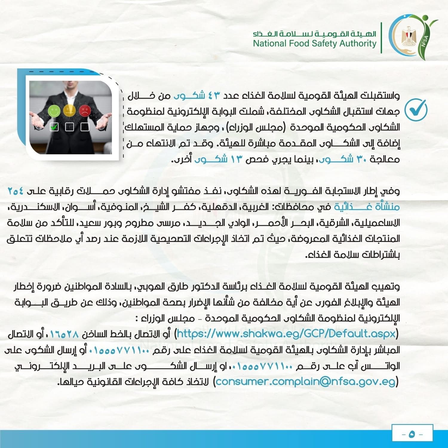 واستقبلت الهيئة القومية لسلامة الغذاء عدد 43 شكوى من خلال جهات استقبال الشكاوى المختلفة، شملت البوابة الإلكترونية لمنظومة الشكاوى الحكومية الموحدة (مجلس الوزراء)، وجهاز حماية المستهلك، إضافة إلى الشكاوى المقدمة مباشرة للهيئة، وقد تم الانتهاء من معالجة 30 شكوى، بينما يجري فحص 13 شكوى أخرى.
