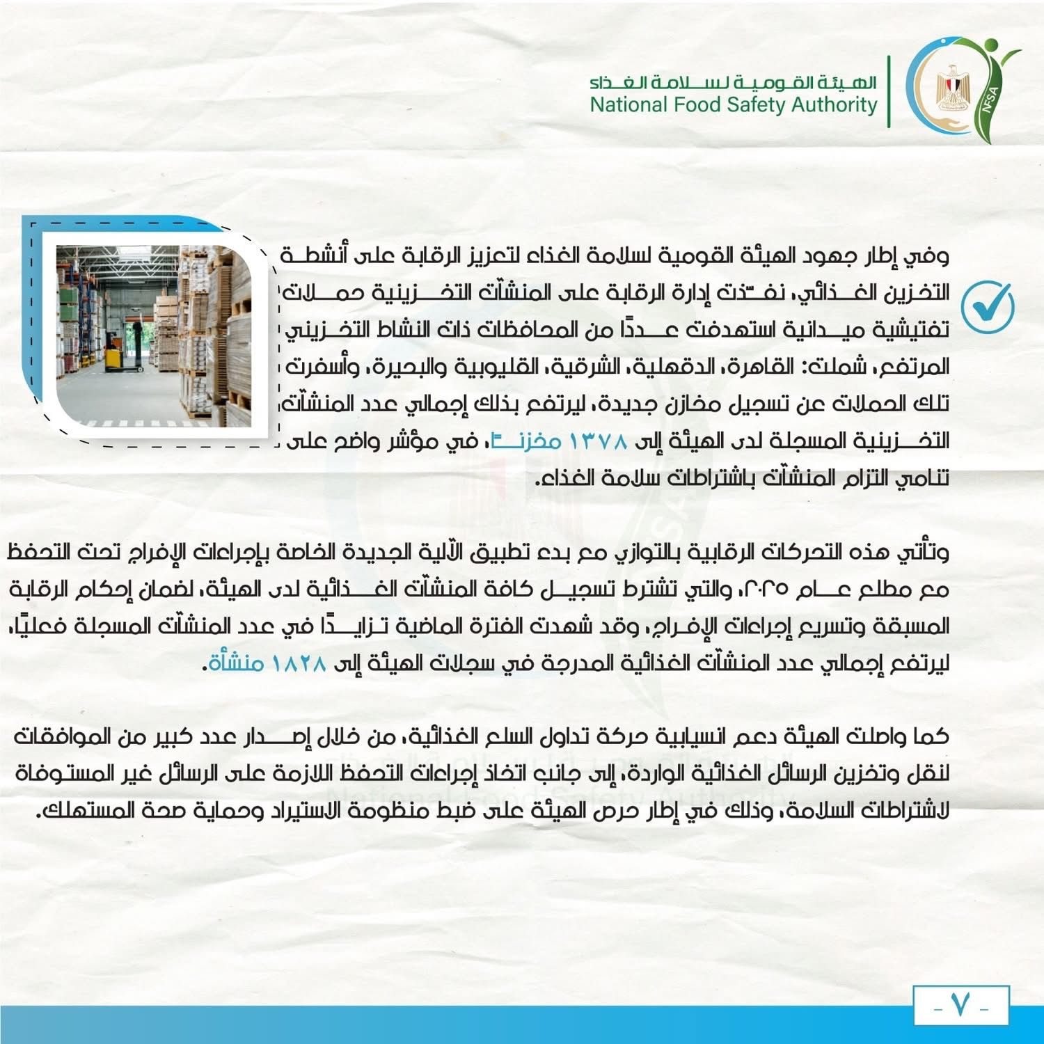 وفي إطار جهود الهيئة القومية لسلامة الغذاء لتعزيز الرقابة على أنشطة التخزين الغذائي، نفّذت إدارة الرقابة على المنشآت التخزينية حملات تفتيشية ميدانية استهدفت عددًا من المحافظات ذات النشاط التخزيني المرتفع، شملت: القاهرة، الدقهلية، الشرقية، القليوبية والبحيرة، وأسفرت تلك الحملات عن تسجيل مخازن جديدة، ليرتفع بذلك إجمالي عدد المنشآت التخزينية المسجلة لدى الهيئة إلى 1378 مخزنًا، في مؤشر واضح على تنامي التزام المنشآت باشتراطات سلامة الغذاء.
