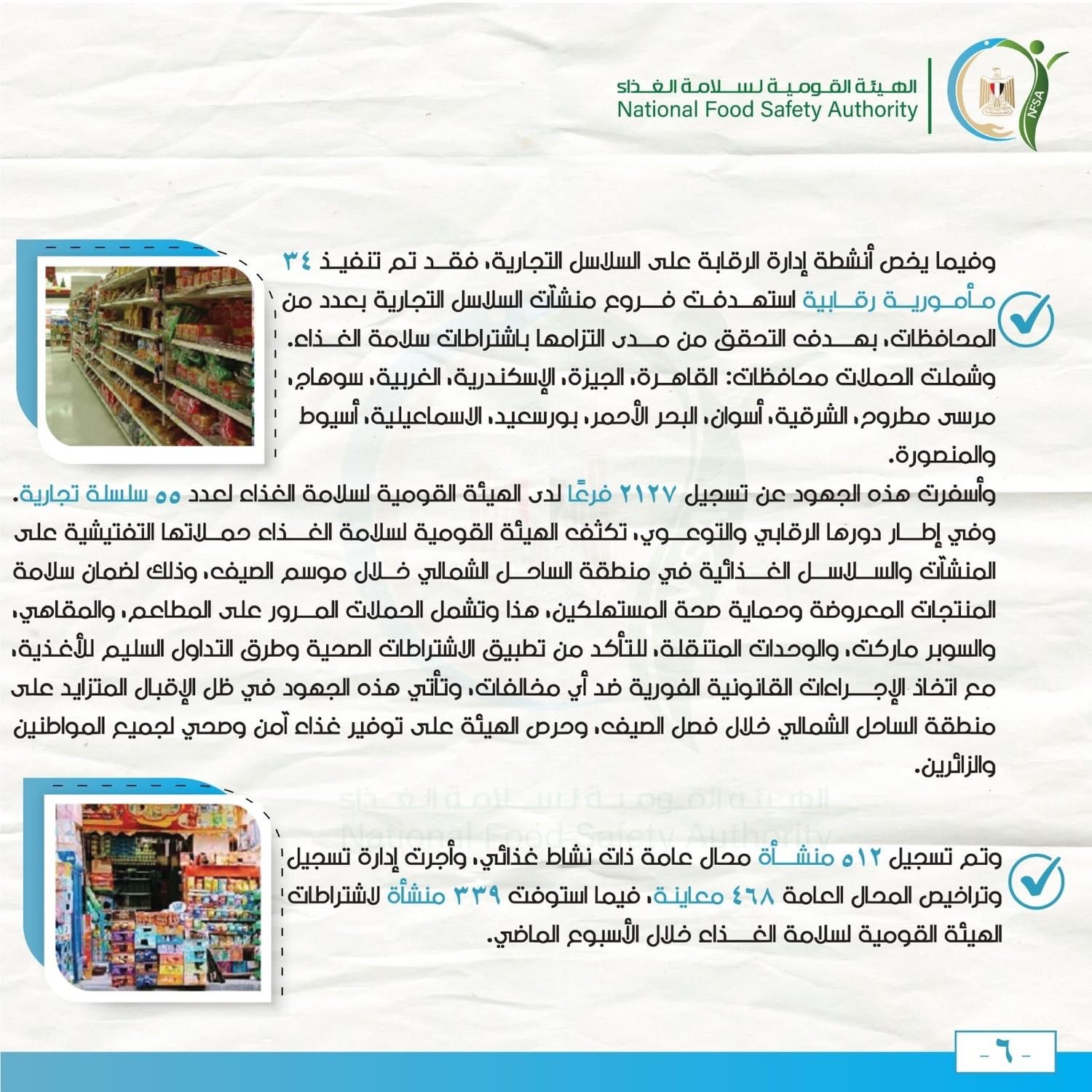 وفيما يخص أنشطة إدارة الرقابة على السلاسل التجارية، فقد تم تنفيذ 34 مأمورية رقابية استهدفت فروع منشآت السلاسل التجارية بعدد من المحافظات، بهدف التحقق من مدى التزامها باشتراطات سلامة الغذاء. وشملت الحملات محافظات: القاهرة، الجيزة، الإسكندرية، الغربية، سوهاج، مرسى مطروح، الشرقية، أسوان، البحر الأحمر، بورسعيد، الاسماعيلية، أسيوط والمنصورة.