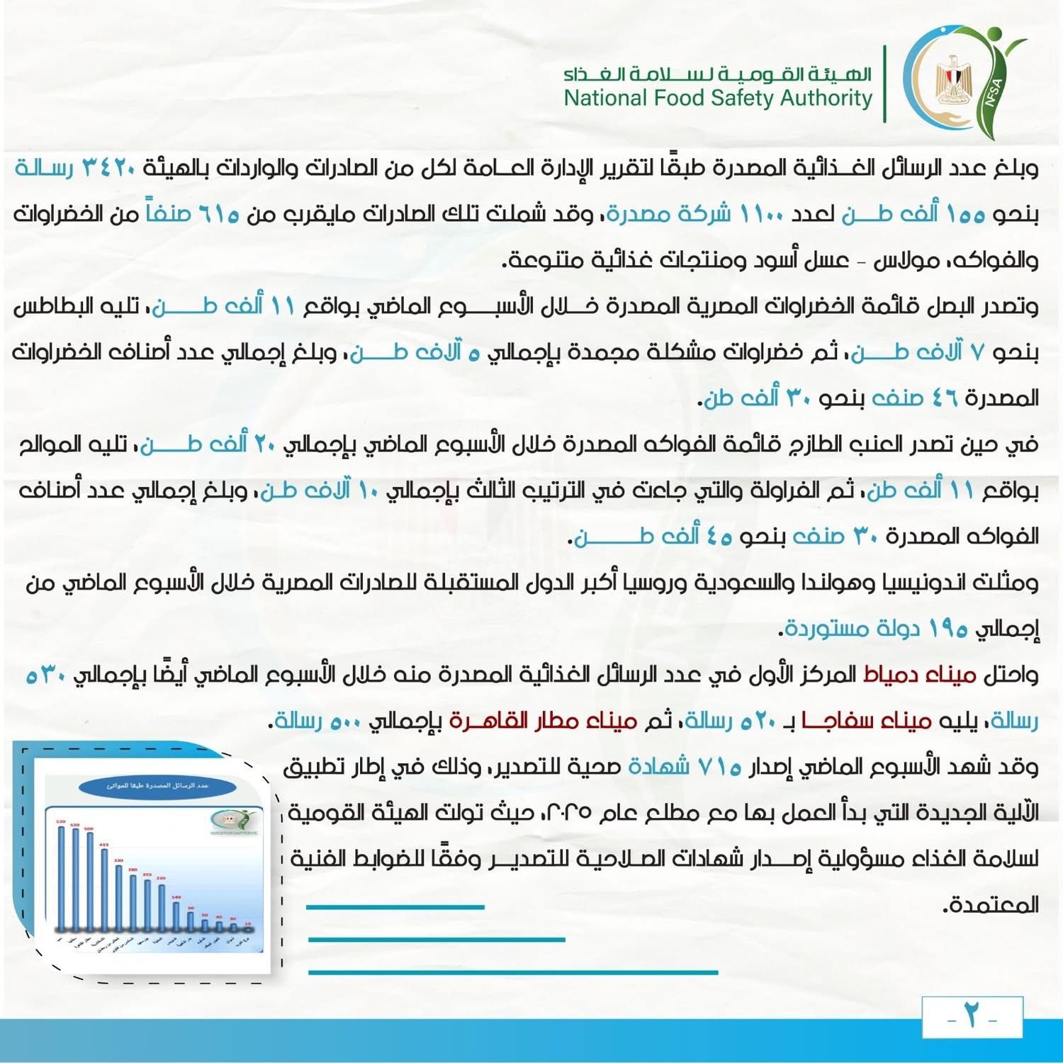 وبلغ عدد الرسائل الغذائية المصدرة طبقًا لتقرير الإدارة العامة لكل من الصادرات والواردات بالهيئة 3420 رسالة بنحو 155 ألف طن لعدد 1100 شركة مصدرة، وقد شملت تلك الصادرات مايقرب من 615 صنفاً من الخضراوات والفواكه، مولاس – عسل أسود ومنتجات غذائية متنوعة.
