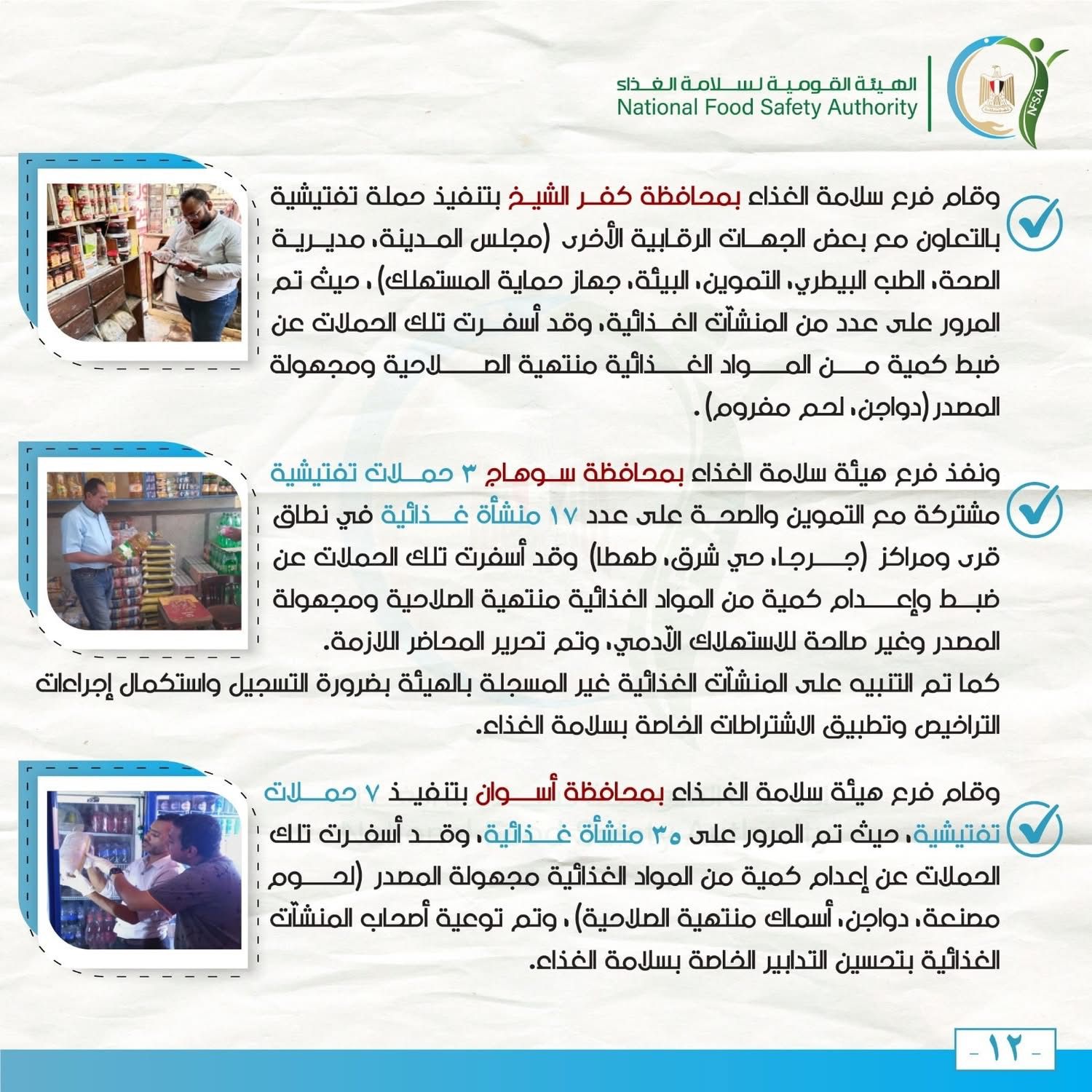 وقام فرع هيئة سلامة الغذاء بمحافظة أسوان بتنفيذ 7 حملات تفتيشية، حيث تم المرور على 35 منشأة غذائية، وقد أسفرت تلك الحملات عن إعدام كمية من المواد الغذائية مجهولة المصدر (لحوم مصنعة، دواجن، أسماك منتهية الصلاحية)، وتم توعية أصحاب المنشآت الغذائية بتحسين التدابير الخاصة بسلامة الغذاء.