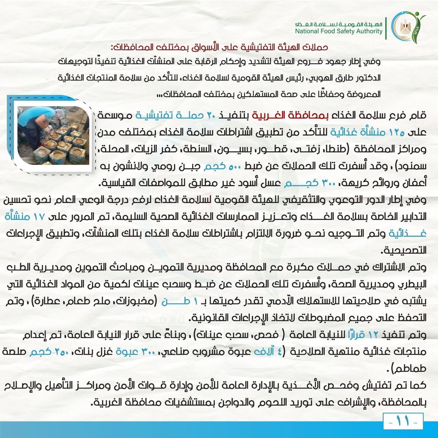 قام فرع سلامة الغذاء بمحافظة الغربية بتنفيذ 20 حملة تفتيشية موسعة على 125 منشأة غذائية للتأكد من تطبيق اشتراطات سلامة الغذاء بمختلف مدن ومراكز المحافظة (طنطا، زفتى، قطور، بسيون، السنطة، كفر الزيات، المحلة، سمنود)، وقد أسفرت تلك الحملات عن ضبط 500 كجم جبن رومي ولانشونبه أعفان وروائح كريهة، 300 كجم عسل أسود غير مطابق للمواصفات القياسية.