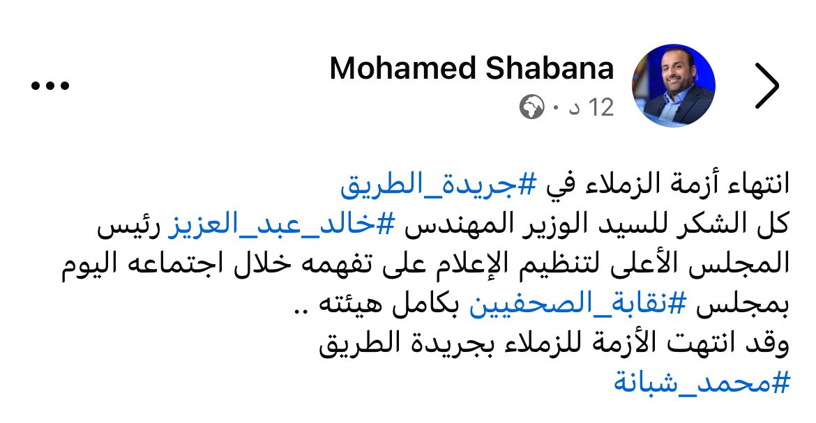 وكتب محمد شبانة من خلال حسابه الرسمي عبر موقع التواصل الإجتماعي “فيسبوك”: “انتهاء أزمة الزملاء في جريدة الطريق، كل الشكر للسيد الوزير المهندس خالد عبد العزيز رئيس المجلس الأعلى لتنظيم الإعلام على تفهمه خلال اجتماعه اليوم بمجلس نقابة الصحفيين بكامل هيئتة.. وقد انتهت الأزمة للزملاء بجريدة الطريق”.