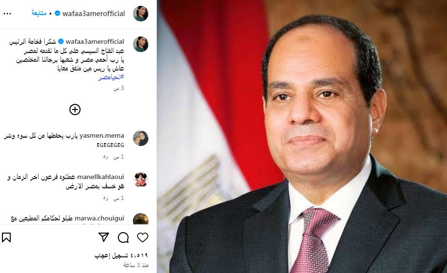 ونشرت وفاء عامر صورة للرئيس عبد الفتاح السيسي عبر صفحتها الرسمية "إنستجرام" وكتبت" شكرا فخامة الرئيس عبد الفتاح السيسي علي كل ما تقدمه لمصر، يا رب أحمي مصر وشعبها برجالنا المخلصين".