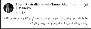 وكتب شريف خير الله من خلال حسابه الرسمي عبر موقع التواصل الاجتماعي فيسبوك، قال:" تعازية للصديق والفنان المحترم تامر عبد المنعم في وفاة والده، وندعوا الله يرحمه ويغفر له ويسكنه فسيح جناته ويصبر قلوبكم".