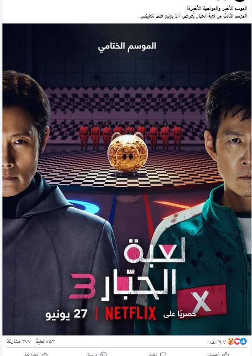 كما أعلنت منصة نتفليكس الموسم الأخير والمواجهة الأخيرة! الموسم الثالث من لعبة الحبّار يُعرض 27 يونيو الجاري.
