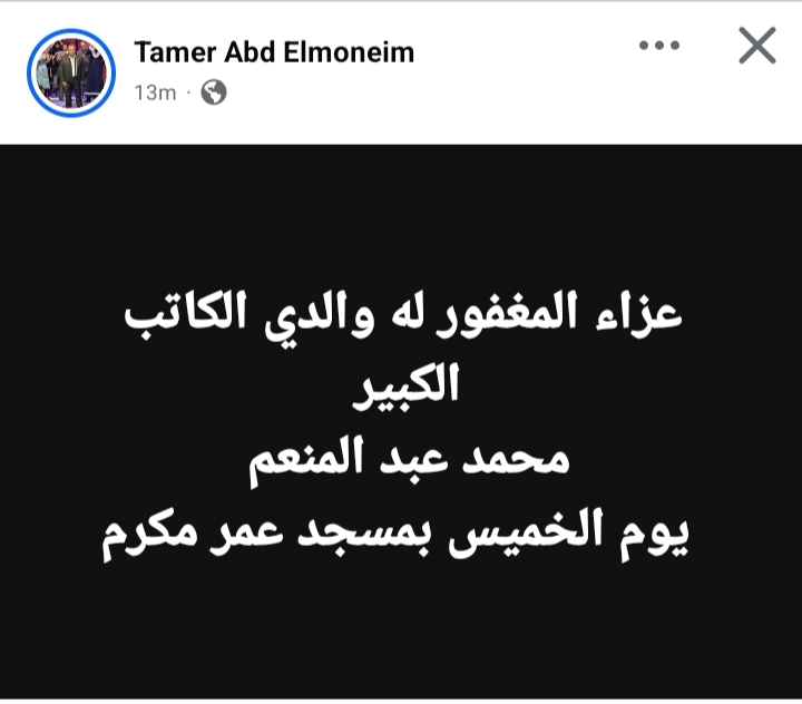 وأعلن الفنان تامر عبد المنعم عن موعد عزاء والده، حيث كتب من خلال حسابه الرسمي عبر موقع التواصل الاجتماعي فيسبوك: "عزاء المغفور له والدي الكاتب الكبير محمد عبد المنعم يوم الخميس بمسجد عمر مكرم".