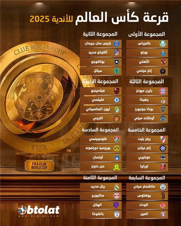 وتقسم الفرق المشاركة إلى ثماني مجموعات، يتأهل أول وثاني كل مجموعة إلى دور الـ16، ما يفتح الباب أمام مواجهات من العيار الثقيل بين كبار أندية أوروبا، أمريكا الجنوبية، وآسيا، مع حضور لافت للفرق العربية.