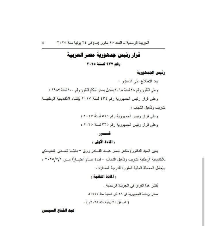 أعرب اللواء أشرف الجندي، محافظ الغربية، عن بالغ سعادته واعتزازه بصدور القرار الجمهوري رقم 327 لسنة 2025، الذي أصدره فخامة الرئيس عبد الفتاح السيسي رئيس الجمهورية، بتعيين الدكتور طاهر نصر عبد القادر رزق، ابن محافظة الغربية، نائبًا للمدير التنفيذي للأكاديمية الوطنية لتدريب وتأهيل الشباب، اعتبارًا من الأول من يوليو المقبل، ولمدة عام، مؤكدًا أن القرار يعكس ثقة القيادة السياسية في أبناء الغربية من أصحاب الفكر المستنير والعطاء الوطني الصادق.
