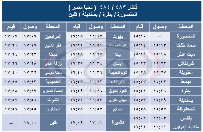 - تشغيل قطار 483 – 484 ( خدمة جديدة ) بعربات تحيا مصر بين محطتى المنصورة وقلين حيث يقوم من محطة المنصورة الساعة 15:10 ويصل محطة قلين الساعة 18:00 طبقاً للجدول المرفق .