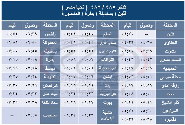 كما قررت الهيئة اعتباراً من يوم 28 / 6 / 2025 امتداد قطار 485 ( تحيا مصر ) لمحطة المنصورة طريق وصلة بطرة / بسنديلة المستجدة برقم 482 حيث يصل المنصورة الساعة 07:45 طبقا للجدول المرفق .
