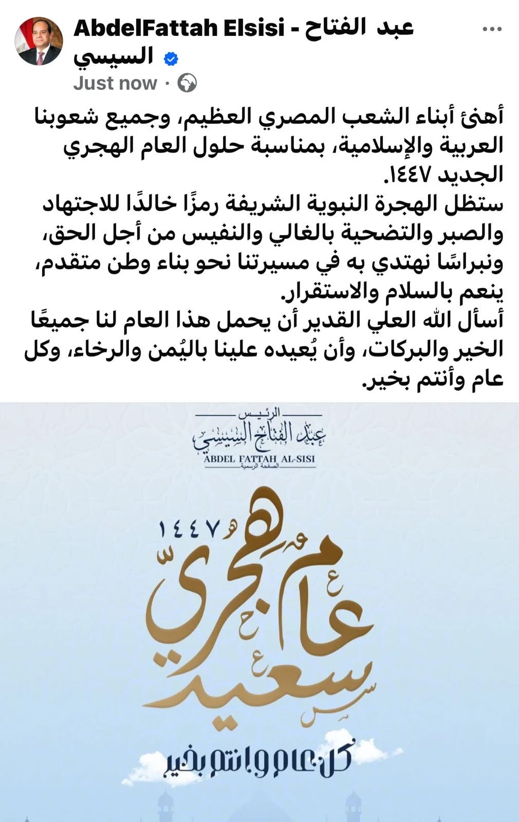 هنأ الرئيس عبدالفتاح السيسي، أبناء الشعب المصري العظيم، وجميع الشعوب العربية والإسلامية، بمناسبة حلول العام الهجري الجديد 1447.