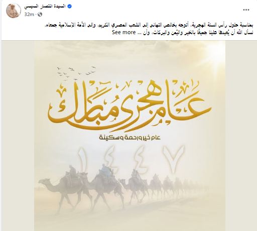 وكتبت السيدة انتصار السيسي عبر صفحتها الرسمية على موقع "فيسبوك":"بمناسبة حلول رأس السنة الهجرية، أتوجه بخالص التهاني إلى الشعب المصري الكريم، وإلى الأمة الإسلامية جمعاء".