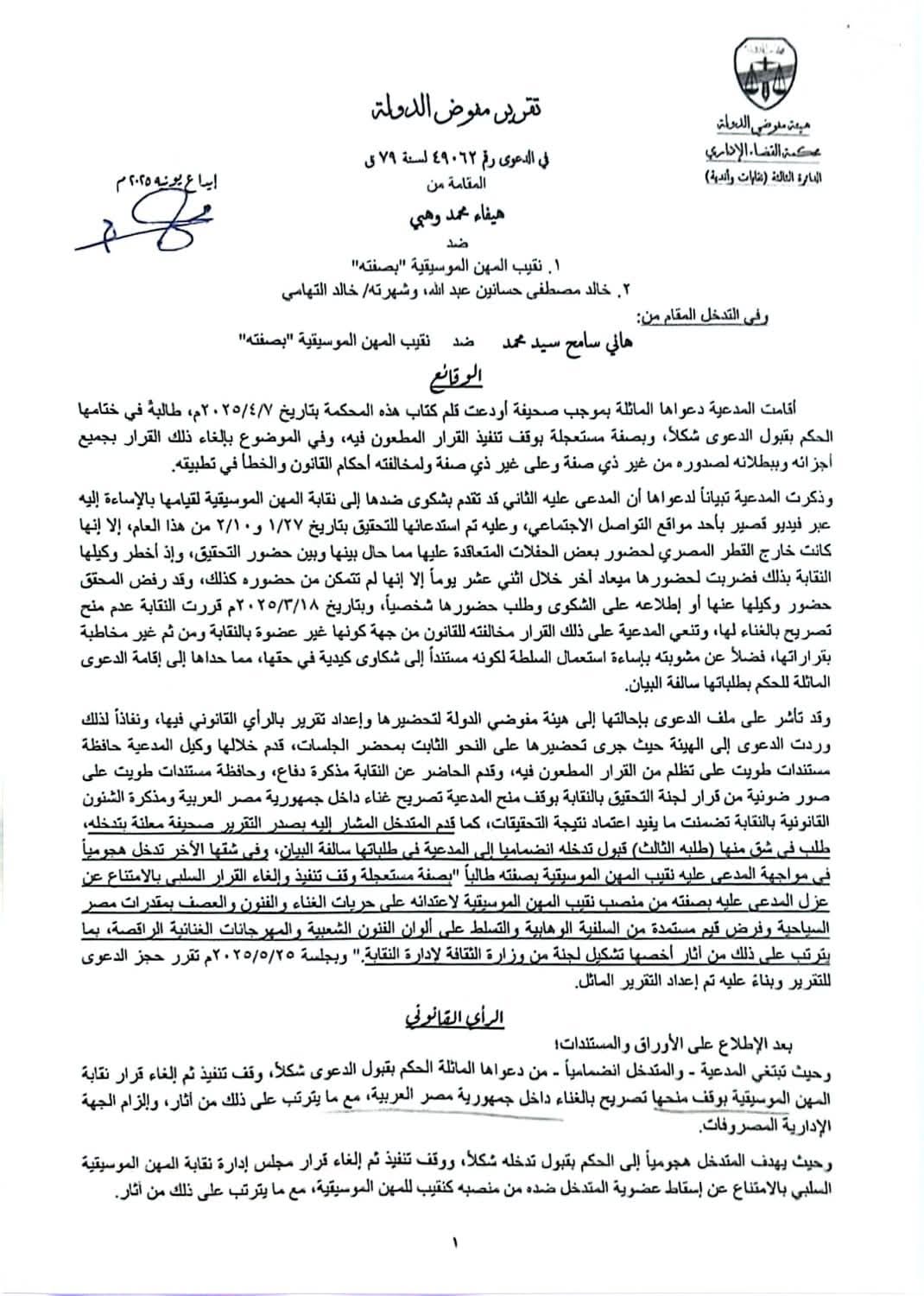 وتابع:"وجاءت التوصية في الدعوى رقم 49062 لسنة 79 قضائية، المقامة من الفنانة هيفاء وهبي، والمتدخل فيها الدكتور هاني سامح المحامي ، ضد نقابة المهن الموسيقية ونقيبها مصطفى كامل، والتي تم تأجيل نظرها إلى جلسة 10 يوليو المقبل لتبادل المذكرات".