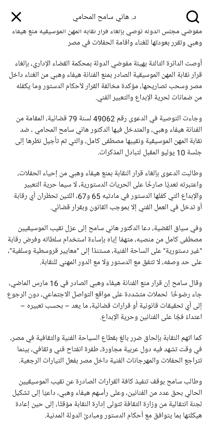 وقال: "مفوضي مجلس الدولة توصي بإلغاء قرار نقابة المهن الموسيقية منع هيفاء وهبي وتقرر بعودتها للغناء واقامة الحفلات في مصر".