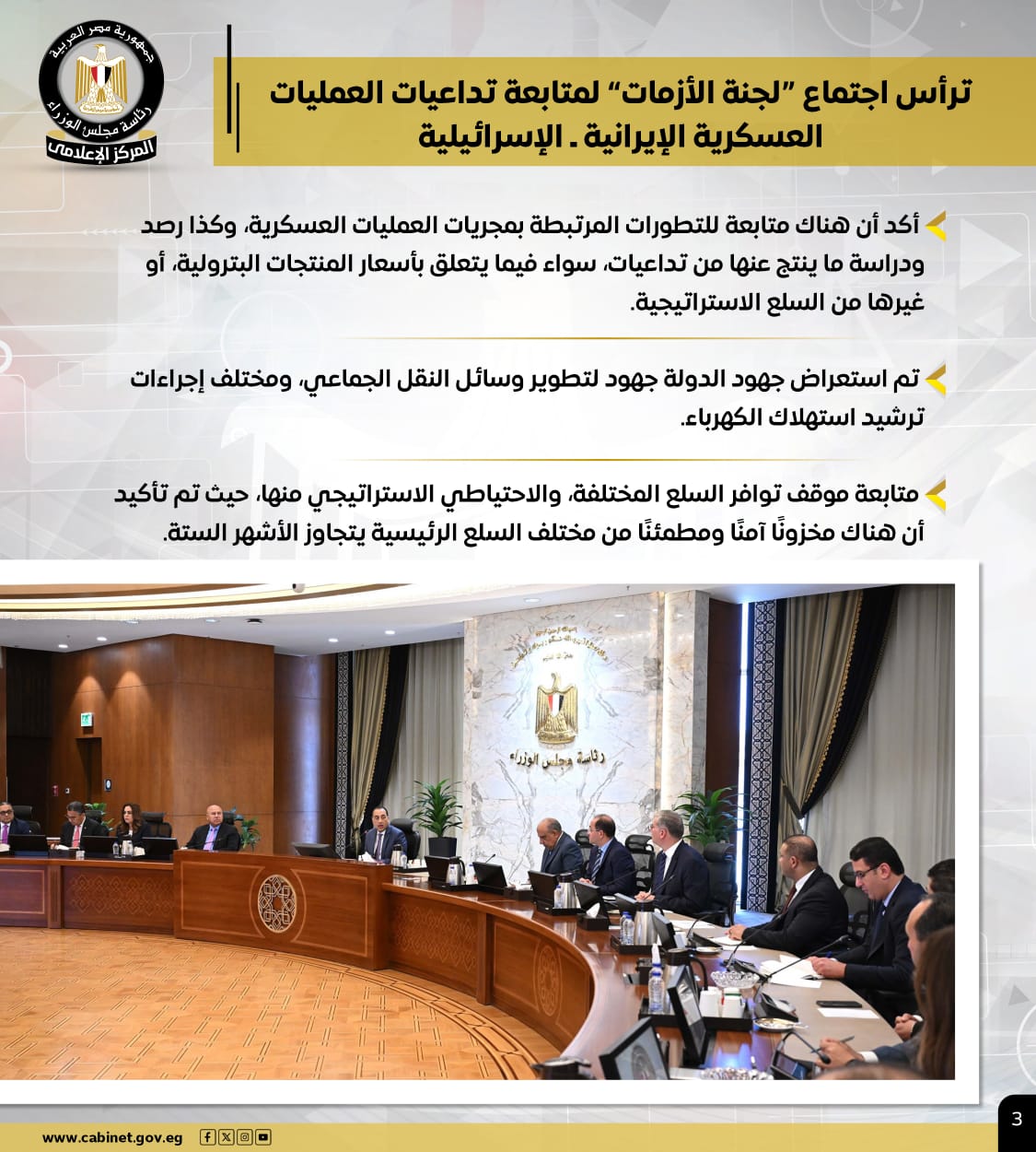 كما ترأس سيادته اجتماع "لجنة الأزمات" لمتابعة تداعيات العمليات العسكرية الإيرانية ـ الإسرائيلية، مؤكدًا متابعة تطور مجريات العمليات العسكرية، مع رصد أسعار المنتجات البترولية، والسلع الاستراتيجية الأخرى ومتابعة موقف توافر مختلف السلع.