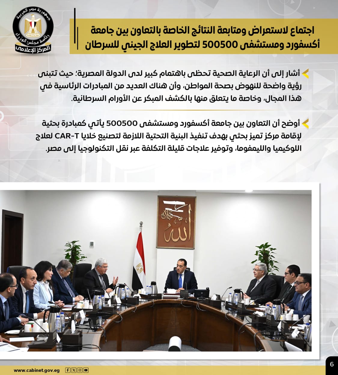 كما عقد سيادته اجتماعًا لاستعراض ومتابعة النتائج الخاصة بالتعاون بين جامعة أكسفورد ومستشفى 500500 لتطوير العلاج الجيني للسرطان، مشيرًا إلى أن هذا التعاون يأتي كمبادرة بحثية لإقامة مركز تميز بحثي، بهدف تنفيذ البنية التحتية اللازمة لتصنيع خلايا CAR-T لعلاج اللوكيميا والليمفوما، وتوفيرعلاجات قليلة التكلفة عبر نقل التكنولوجيا إلى مصر.