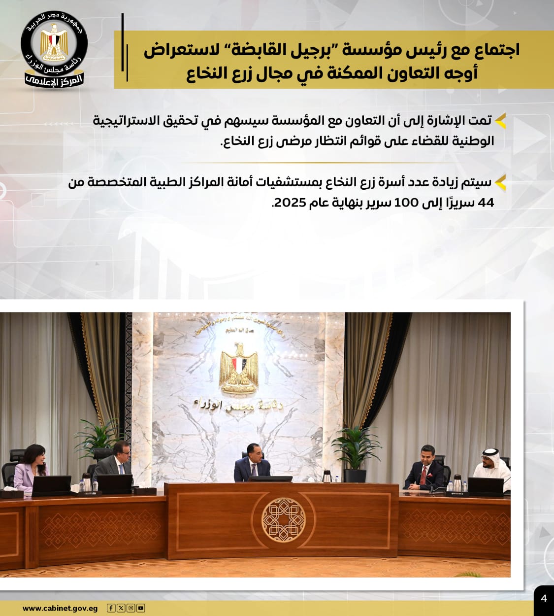 وشملت الأنشطة، اجتماع رئيس الوزراء مع رئيس مؤسسة "برجيل القابضة" لاستعراض أوجه التعاون الممكنة في مجال زرع النخاع، وتمت الإشارة إلى أن التعاون مع المؤسسة سيسهم في تحقيق الاستراتيجية الوطنية للقضاء على قوائم انتظار مرضى زرع النخاع، كما سيتم زيادة عدد أسرة زرع النخاع بمستشفيات أمانة المراكز الطبية المتخصصة من 44 سريرًا إلى 100 سرير بنهاية عام 2025.